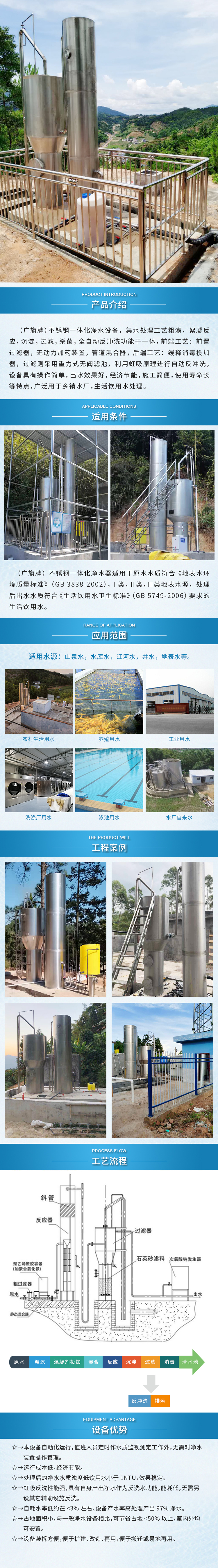 (廣旗牌)不銹鋼一體化凈水設(shè)備,集水處理工藝粗濾,絮凝反應(yīng),沉淀,過(guò)濾,殺菌,全自動(dòng)反沖洗功能于一體,前端工藝:前置過(guò)濾器,無(wú)動(dòng)力加藥裝置,管道混合器,后端工藝:緩釋消毒投加器,過(guò)濾則采用重力式無(wú)閥濾池,利用虹吸原理進(jìn)行自動(dòng)反沖洗,設(shè)備具有操作簡(jiǎn)單,出水效果好,經(jīng)濟(jì)節(jié)能,施工簡(jiǎn)便,使用壽命長(zhǎng)等特點(diǎn),廣泛用于鄉(xiāng)鎮(zhèn)水廠,生活飲用水處理。